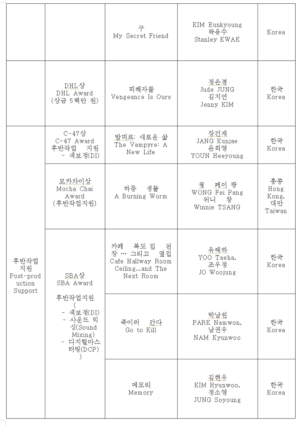 후반작업 현물지원은 SBA상, C-47상, 모카차이상 등이다. SBA상(총 3억원 상당)은 <카페 복도 집 천장… 그리고 옆집>(감독 유태하), <죽이러 간다>(감독 박남원), <메모리>(감독 김현우) 등 한국 작품 3편이 나란히 수상했다. 색보정·사운드믹싱·디지털마스터링을 지원받는다. 색보정(DI)을 지원하는 C-47상은 <밤피르: 새로운 삶>(감독 장건재), DI·사운드 믹싱 등 후반작업을 지원하는 모카차이상은 <하등 생물>(감독 웡 페이 팡)이다.