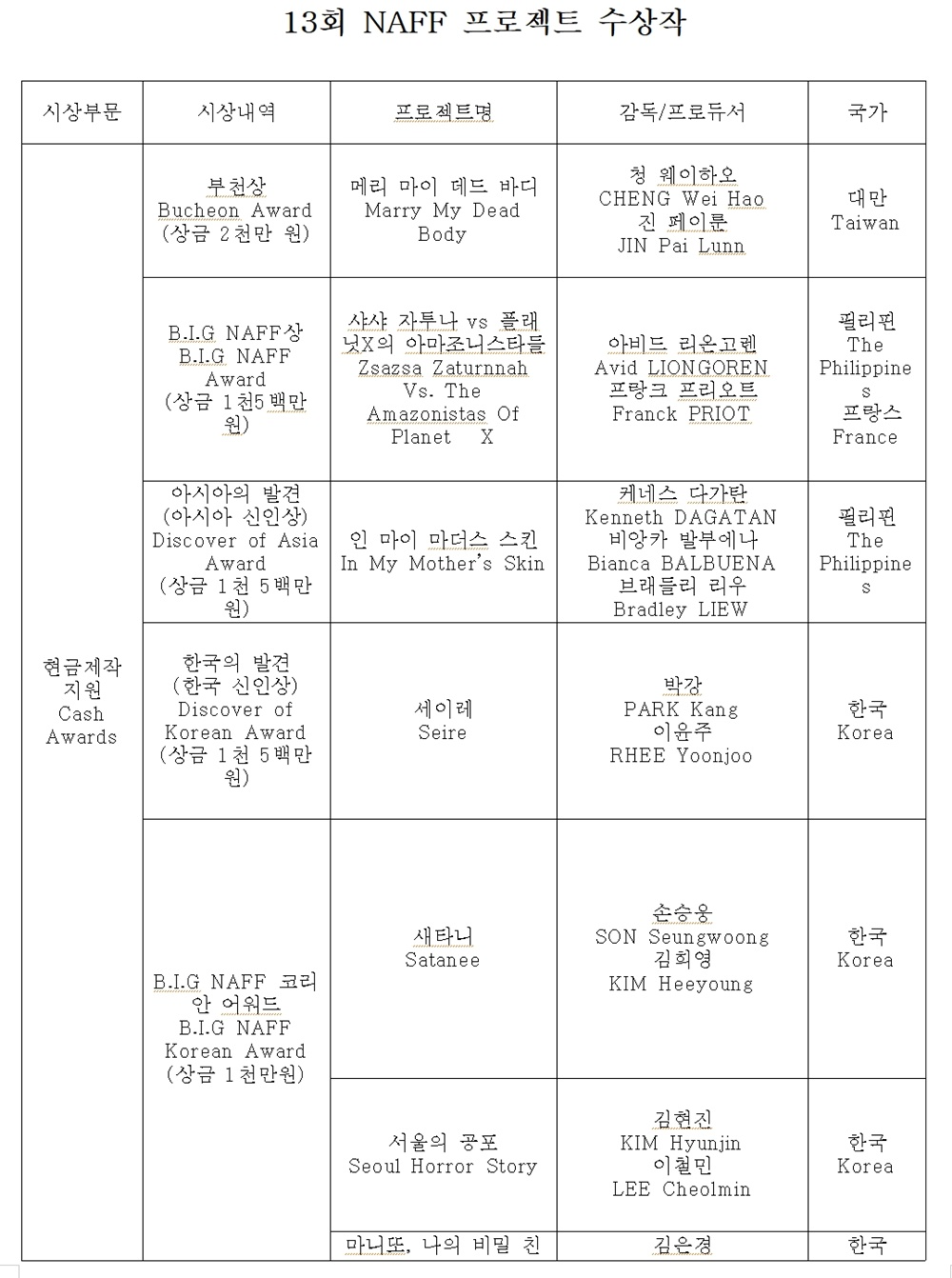 각각 1500만원을 시상하는 B.I.G NAFF상은 <샤샤 자투나 vs 플래닛X의 아마조니스타들>(필리핀·프랑스), 아시아의 발견상은 <인 마이 마더스 스킨>(필리핀), 한국의 발견상은 <세이레>(한국)가 차지했다. <샤샤 자투나 vs 플래닛X의 아마조니스타들>(감독 아비드 리온고렌)은 사회적인 관습·성정체성·사회적 계급 같은 쉽게 답을 내릴 수 없는 이슈들을 유쾌하게 돌파하는 이야기다. <인 마이 마더스 스킨>(감독 케네스 다가탄)은 전쟁에 보낸 남편이 돌아오길 학수고대하며 영혼이 타들어 가는 심리를 잔혹하고 슬픈 동화로 풀어냈다. <세이레>(감독 박강)는 ‘생과 사’라는 극명히 대조되는 상황의 조합만으로 오싹한 호러의 설정을 이루며 익숙한 것에서 새로운 공포심을 끌어내는 호러 영화다.